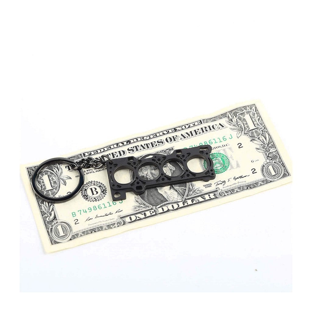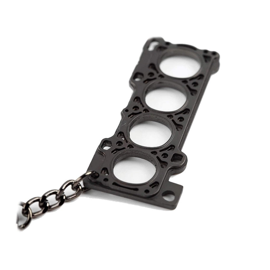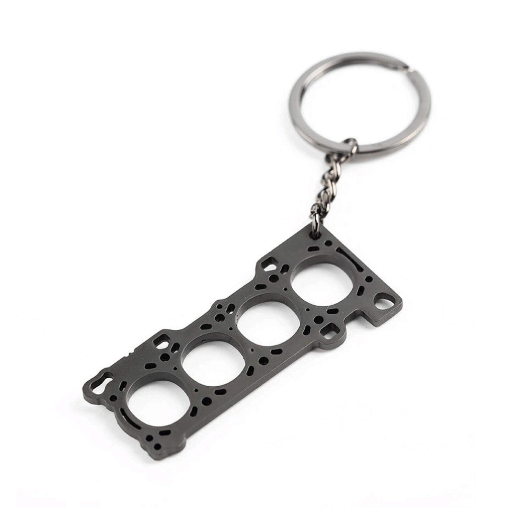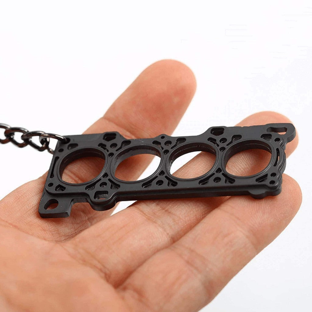 A stylish, cast keychain for car keys made from a metal alloy in the shape of a head gasket. This is the perfect keychain gift for car owners.